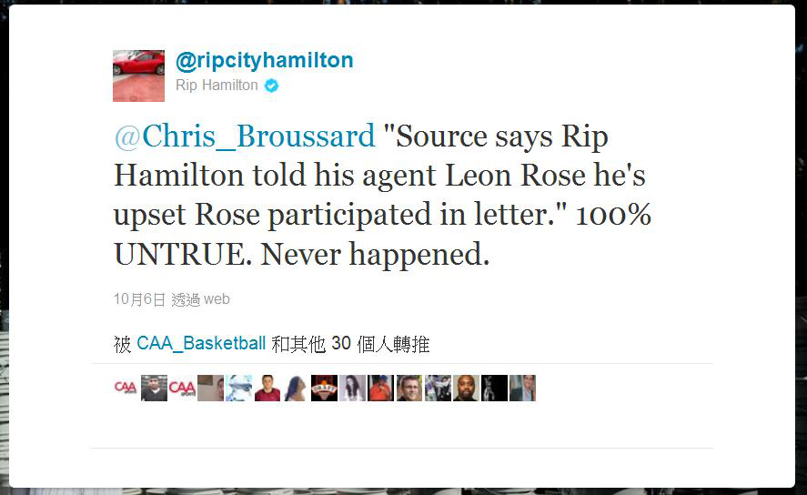 11. 據傳有一群經紀人是反對球員工會的存在的,而知名經紀人Leon Rose便是他們的成員之一。消息來源指出上個週末他們寄了一封信給球員們,而RIP(Richard Hamilton)在得知後大為光火,並告訴Rose若他不離開所謂的anti-union團體他就要和其他的球員一起離開。但RIP在得知這個消息後否認了這件事。